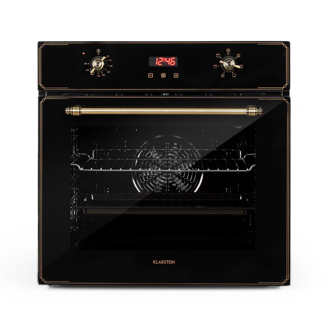 Der Backofen verbindet den optischen Charme des 19. Jahrhunderts mit der modernen Technik des 21. Jahrhunderts und verzaubert deine Küche. Mit dem Backofen holst du dir pures Retro-Design direkt in deine Küchenzeile: Knöpfe in Messingoptik, ein ähnlicher Griff an der Backofentür und eine abgerundete Formensprache lassen den Zauber vergangener Tage wieder aufleben. Gleichzeitig verfügt das Gerät über modernste Funktionen: Mit 2200 Watt und der Energieeffizienzklasse A bereitet er in seinem großen 70-Liter-Garraum nicht nur Kuchen, Aufläufe oder Pizzen gekonnt und sparsam zu. Im Inneren arbeiten Umluft, Ober- und Unterhitze sowie eine Grillfunktion in sechs Kombinationen auf Abruf und erfüllt alle Anforderungen an einen unkomplizierten und leistungsstarken Küchenofen. Außerdem bietet der Einbaubackofen einen einfach zu bedienenden Gartimer für bis zu zehn Stunden, wählbare Temperaturen zwischen 50 und 250°C sowie ein integriertes Digitaldisplay zur Anzeige aller Einstellungen. Mit seinem klassisch stilvollen Design und den messingfarbenen Elementen setzt der Elektrobackofen einen edlen Blickfang im Retro-Stil in jeder Küche. Klarstein Farbe/Ausführung: Schwarz