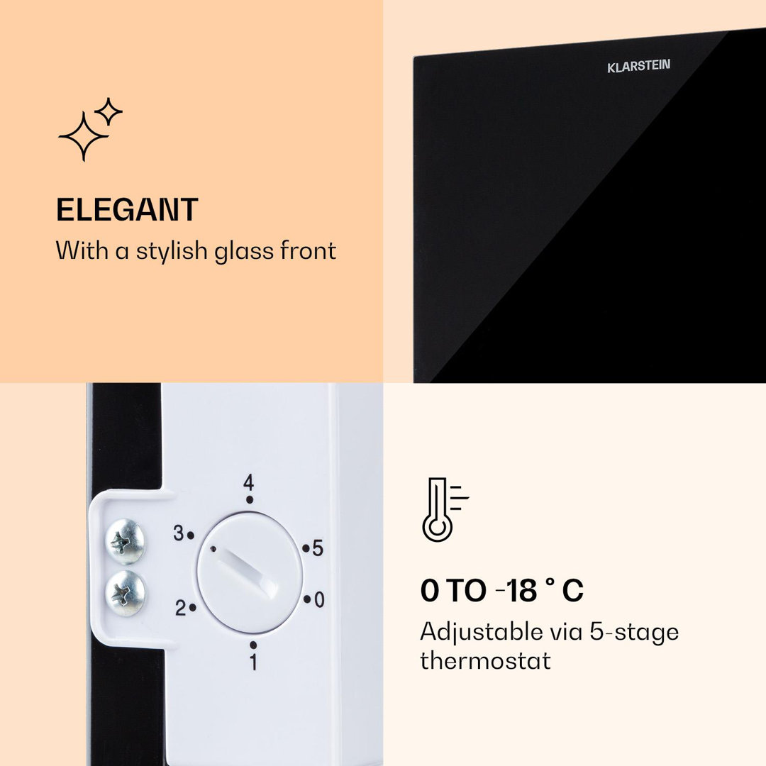 Mini-Kühlschrank, 60 L, 4 -Sterne Gefrierschrank bis -18 °C Mit dem Fünf-Stufen-Thermostat kann die Kühltemperatur auf -18 °C gesenkt werden. Das schlichte Design des Mini-Kühlschranks wird durch die glasverkleidete Tür wunderbar abgerundet. Schick, zuverlässig und kompakt: Der praktische 60-Liter-Gefrierschrank von Klarstein. Gefrierschrank im klassischen Look. 60 L Fassungsvermögen. Viel Platz für Gefriergut. Schlichtes Design, ideal für Büros, Ferienhäuser sowie Arbeits- oder Gästezimmer; Elegant, mit einer stilvollen Glasfront. 0 bis -18 °C. Einstellbar über einen fünfstufigen Thermostat. Klarstein Farbe/Ausführung: Schwarz