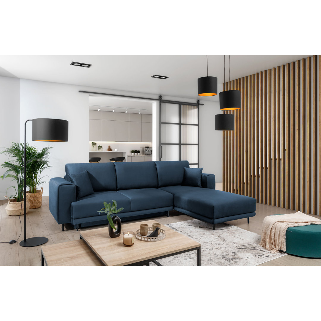 Modernes Ecksofa Dalia – ein Ecksofa mit Seele Die Wohnzimmerecke besteht aus mehreren hochwertigen Komponenten. All das, damit es dir besonders lange in perfektem Zustand dienen kann. Für die Sitzfläche des Möbels wurden gewellte Federn vom Typ B verwendet, die durch hochelastischen HR-Schaum ergänzt werden. Dadurch ist die Oberfläche des Produkts beeindruckend weich und flexibel, passt sich aber trotzdem sanft an die Körperform des Nutzers an. Dadurch ist es in der Lage, deine Muskeln sanft zu entlasten und die angesammelten Verspannungen zu beseitigen und sie durch ein Gefühl von Entspannung und Komfort zu ersetzen. Außerdem bleibt das Möbelstück resistent gegen unansehnliche Faltenbildung! Auf der anderen Seite erwacht die Rückenlehne der Ecke mit Schaumgranulat gefüllten Kissen und einem beweglichen, umgedrehten Teil voller T2540-Schaum. Diese Elemente zusammen machen unser Produkt in der Lage, sich richtig um deine Wirbelsäule zu kümmern. Es stützt ihre empfindlichen Kurven, so dass selbst ein paar Stunden in einer Position keine negativen Auswirkungen auf ihre Gesundheit haben. Das ist aber noch nicht das Ende der Vorteile des von uns angebotenen Modells! Es verfügt über eine einfach zu bedienende Schlaffunktion, mit der du schnell ein richtig bequemes Bett zaubern kannst. Nie wieder werden Übernachtungsgäste auf eine Luftmatratze zurückgreifen müssen! Erwähnenswert ist auch, dass sich im Inneren ein großer Behälter für Bettzeug befindet. Das Staufach ist in der Lage, alle Arten von Textilien aufzunehmen, was dir die Organisation deines Zimmers erheblich erleichtern wird. Brayden Studio Ausrichtung: Ausrichtung rechts, Polsterfarbe: Blau