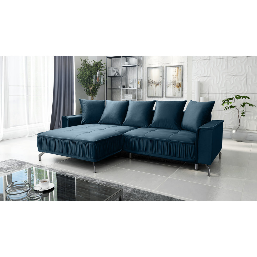 Das vorgestellte Möbelstück ist ein äußerst bequemes Ecksofa im modernen Stil. Dank seiner Größe passt es perfekt in jedes Interieur. Die Sitzfläche des Sofas ist mit Bonellfedern ausgestattet und der Stoff wurde sorgfältig maschinell genäht. Die Beine hingegen sind schwarz und aus Nickel gefertigt. Das Möbelstück besitzt auch eine Schlaffunktion, kann also auch als Bett verwendet werden. Darüber hinaus verfügt es über einen Behälter für Bettzeug und andere Aufbewahrungsgegenstände. Brayden Studio Ausrichtung: Ausrichtung Links, Polsterfarbe: Blau