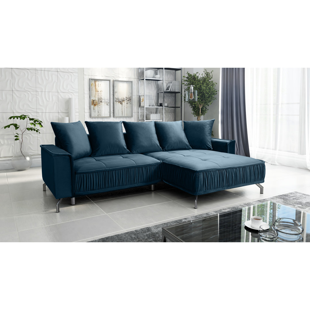 Das vorgestellte Möbelstück ist ein äußerst bequemes Ecksofa im modernen Stil. Dank seiner Größe passt es perfekt in jedes Interieur. Die Sitzfläche des Sofas ist mit Bonellfedern ausgestattet und der Stoff wurde sorgfältig maschinell genäht. Die Beine hingegen sind schwarz und aus Nickel gefertigt. Das Möbelstück besitzt auch eine Schlaffunktion, kann also auch als Bett verwendet werden. Darüber hinaus verfügt es über einen Behälter für Bettzeug und andere Aufbewahrungsgegenstände. Brayden Studio Ausrichtung: Ausrichtung Rechts, Polsterfarbe: Blau