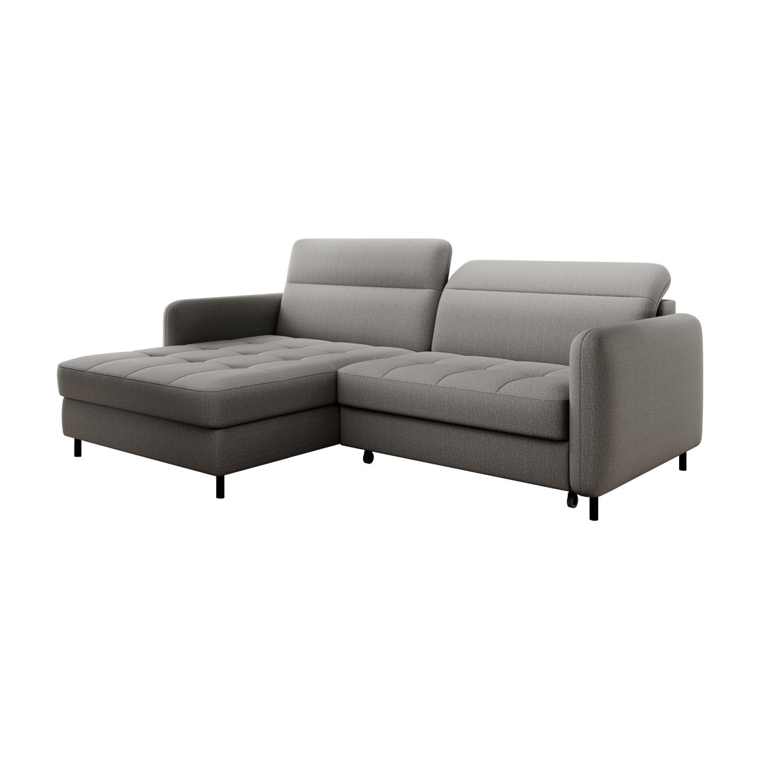Alayssa umbaubares Ecksofa, oder Schönheit auf Knopfdruck Kleine klappbare Ecken sind ein echter Hit in Wohnzimmern. Denn mit ihrer Hilfe kannst du schnell und effizient ein atemberaubendes Interieur zaubern, in dem deine Familie gerne Zeit verbringt. Gleichzeitig nehmen sie viel weniger Platz ein als ihre größeren Vettern, was dir definitiv neue Möglichkeiten eröffnet. Das Modell Alayssa ist da nicht anders: Die universellen Ecksofas dieser Kollektion sind eine Möglichkeit, eine charmante und gemütliche Komposition zu schaffen. Denn ein Blick auf die schlanken Beine aus schwarz lackiertem Metall genügt, um zu verstehen, was das Polsterecksofa Alayssa auszeichnet. Die Elemente geben dem Ganzen nicht nur die nötige Stabilität, sondern gleichen auch das optische Gewicht des gesamten Blocks effektiv aus. In Kombination mit den weichen, fließenden Linien des Korpus und dem hochwertigen Polsterstoff wirkt die Struktur leicht und äußerst attraktiv. Kein Wunder also, dass du durch die Platzierung der Möbel in deinem Wohnzimmer die Möglichkeit hast, ein originelles Arrangement zu schaffen. Und was ist mit der inneren Struktur? In diesem Bereich steht das Ecksofa also nicht zurück! Denn in seiner Rückenlehne findest du T25-Schaum, der von einem flexiblen Polstergürtel gestützt wird. Das bedeutet, dass die Möbel deinem Rücken in jeder Situation den richtigen Halt geben können. Auch die Füllung der Sitzfläche ist erwähnenswert: Hochelastischer HR-Schaum und eine B-Typ-Wellenfeder, ergänzt mit flauschigem Vlies, verleihen dem Ganzen eine unvergessliche Weichheit und Federung. Streck dich also tagsüber auf deinem Ecksofa aus, und du wirst schnell spüren, wie Alayssa deinen Körper sanft umhüllt. Richtig gestützt, werden sich deine Muskeln und dein Rücken schnell entspannen und die Verspannungen, die sich im Laufe des Tages angesammelt haben, gehören endlich der Vergangenheit an. Die verstellbaren Kopfstützen werden das Glücksgefühl noch weiter vertiefen. Schließlich kannst du sie ganz einfach an deine Vorlieben anpassen! Wenn du dich für ein Ecksofa entscheidest, solltest du auch die Erholung in der Nacht nicht vergessen. Zum Glück gibt es bei Alayssa die Schlaffunktion Dolphin, die intuitiv zu bedienen ist. Das bedeutet, dass du das Möbelstück ohne Probleme in ein bequemes Bett verwandeln kannst. Seine angenehme, flexible Oberfläche ersetzt erfolgreich ein Bett und bietet dir sowohl im Urlaub als auch im Alltag eine gute Erholung. Ergänzt wird das Ganze durch einen Bettzeugbehälter, der mit einem Sitzlift ausgestattet ist. Der Mechanismus ermöglicht es, problemlos ins Innere der Struktur zu gelangen und so alle Arten von Textilien zu verstauen. Brayden Studio Ausrichtung: Ausrichtung links, Polsterfarbe: Manhattan 03 Grau
