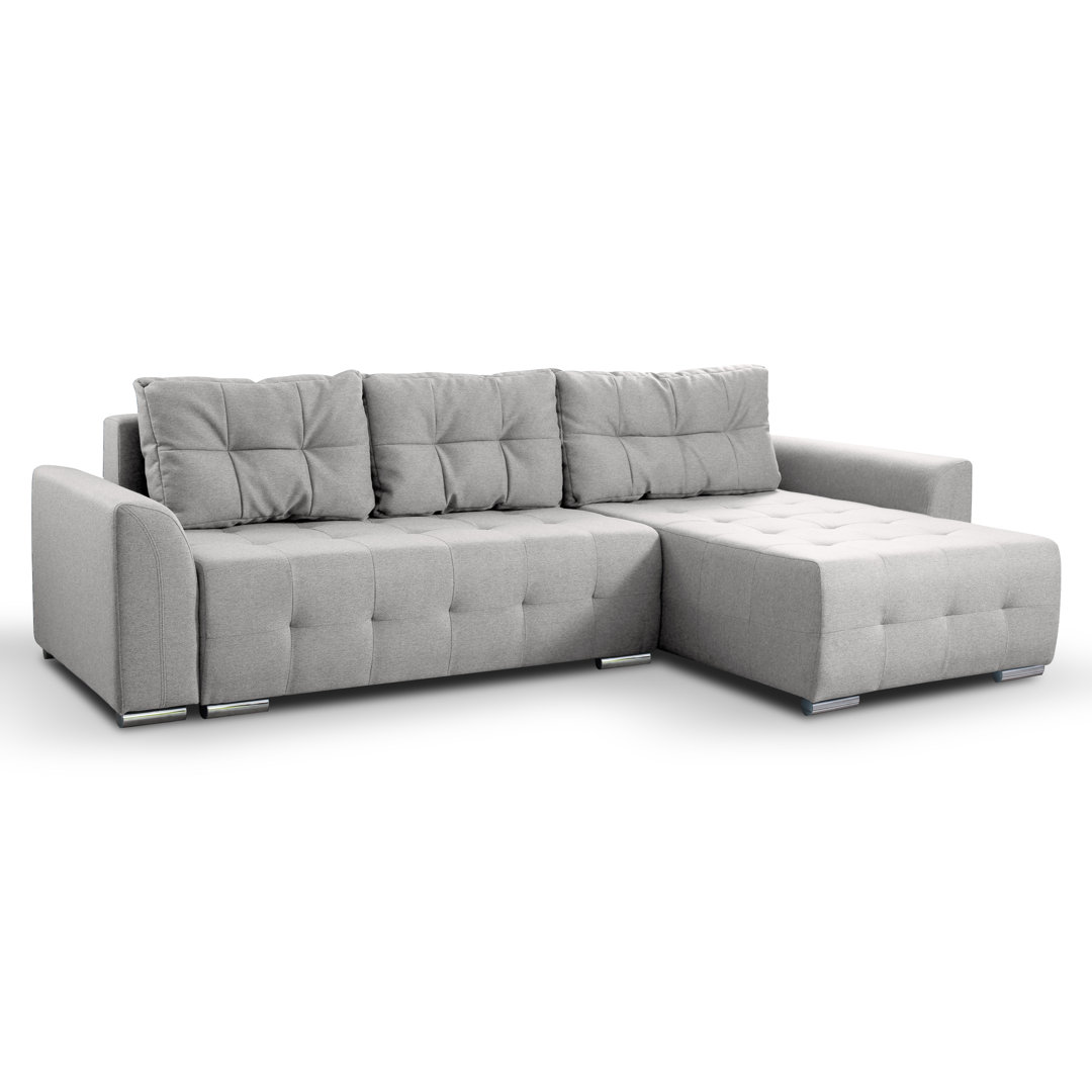 Das universelle Ecksofa mit Schlaffunktion zieht mit seiner zarten Steppung auf der gesamten Oberfläche der Sitz- und Rückenkissen die Aufmerksamkeit auf sich. Die Chaiselongue kann je nach Vorliebe des Nutzers auf der rechten oder linken Seite montiert werden. Dank des praktischen Ausklappsystems erhält der Nutzer zusätzlichen Platz in Form eines Bettes. Das Sofa ist mit einem praktischen Staufach ausgestattet. Es eignet sich perfekt für ein Wohnzimmer oder ein Gästezimmer und ermöglicht es dir, bequem zu entspannen. Schlaffläche: 244×120 cm. Perspections Polsterfarbe: Grau