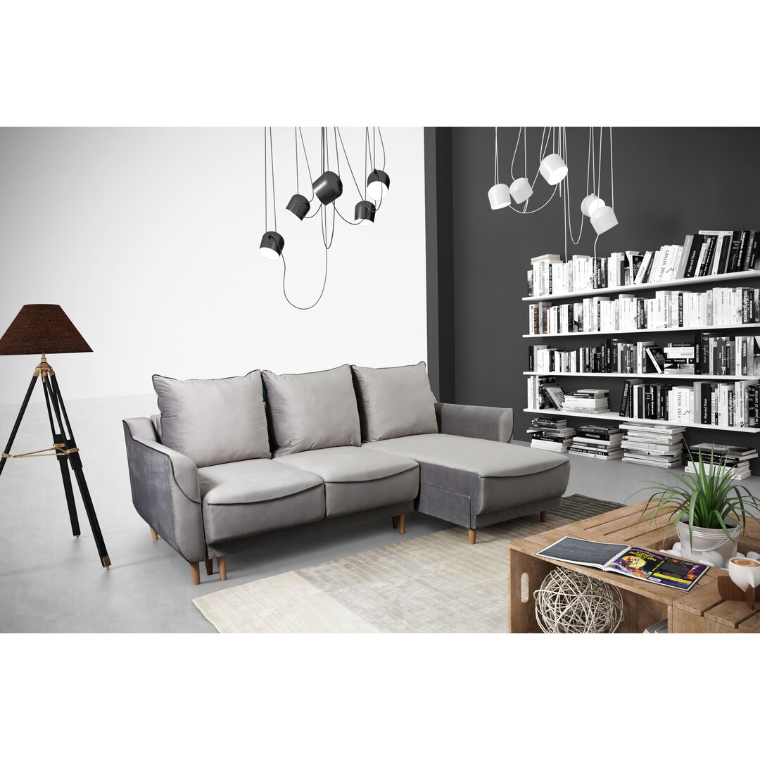 Das Belvedere-Ecksofa ist ein modernes Designerecksofa im skandinavischen Stil mit einer dekorativen Einfassung über die gesamte Länge. Seine schlichte Form macht es perfekt für jede Einrichtung. Neben der praktischen Schlaffunktion verfügt das Möbelstück über zwei Boxen für Bettzeug und einen Mechanismus, der das Aufklappen erleichtert. Das Ecksofa steht auf stilvollen Holzbeinen, die dem Möbelstück eine tolle Note verleihen. Ein zusätzlicher Vorteil sind die Rückenkissen, die mit einer dekorativen Paspelierung versehen sind und den Möbeln einen stilvollen Charakter verleihen. Fairmont Park Polsterfarbe: Grau