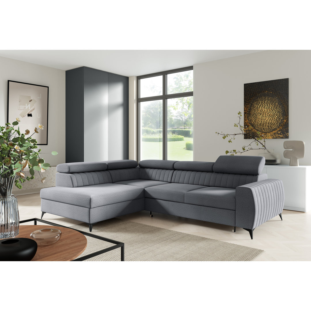 Unser Ecksofa ist eine Kombination aus Stil und Robustheit. Der einzigartige T30/HR-Schaumstoff, der zur Profilierung der Sitzflächen und Rückenlehnen verwendet wird, garantiert unvergleichlichen Komfort für lange Momente der Entspannung. Außerdem verleihen die schwarzen Metallfüße den Möbeln einen modernen Charakter und fügen sich harmonisch in jeden Einrichtungsstil ein. Die innovativen Nähte sind nicht nur ein dekoratives Element, sondern auch eine Bestätigung für die hohe Qualität der Verarbeitung. Mit den beweglichen Kopfstützen kannst du das Möbelstück an deine eigenen Vorlieben anpassen, damit dein Kopf und Nacken in jeder Position gestützt werden. Die DL-Schlaffunktion ist nicht nur ein idealer Ort zum Entspannen, sondern auch zum Schlafen. Die nahtlose Verwandlung vom Sofa zum Bett ermöglicht es dir, deinen Wohnbereich ganz einfach zu planen. Außerdem garantiert die gewundene Feder im Sitz eine optimale Unterstützung des Körpers, so dass auch nach langem Sitzen keine Ermüdungserscheinungen auftreten. Der eingebaute Stauraum für Bettwäsche macht die Aufbewahrung zusätzlicher Gegenstände einfach und bequem. Mit unserem Ecksofa für das Wohnzimmer haben wir Luxus mit Funktionalität kombiniert und einen Platz geschaffen, der nicht nur durch sein Aussehen beeindruckt, sondern auch alle Erwartungen in Bezug auf Qualität und Komfort erfüllt. Entdecke eine neue Dimension der Entspannung mit unserem modernen Ecksofa! Perspections Polsterfarbe: Grau, Ausrichtung: Ausrichtung Links