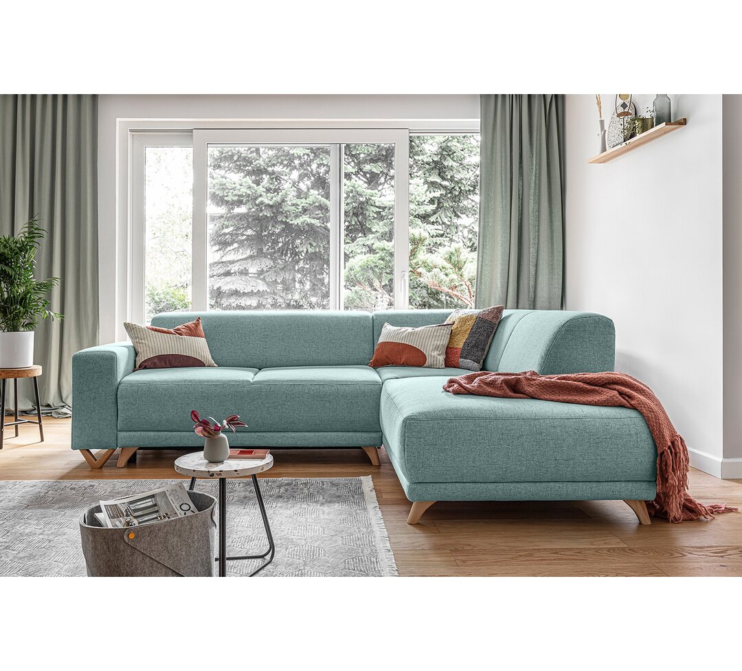 Sag hallo zum Ecksofa Classy Sophie mit Bettfunktion. Es bietet bequem Platz für mehr als fünf Personen und du kannst es ganz einfach in ein Bett umwandeln. Der Stoff in Leinenoptik und die massiven Holzbeine verleihen ihm eine naturbelassene Optik. Da es von allen Seiten vollständig bezogen ist, kannst du dieses Sofa auch in der Mitte eines Raumes aufstellen. Es hat eine praktische Seitentasche und bietet Stauraum für Decken und andere Dinge. MiuForm Polsterfarbe: Blau, Ausrichtung: Rechts ausgerichtet