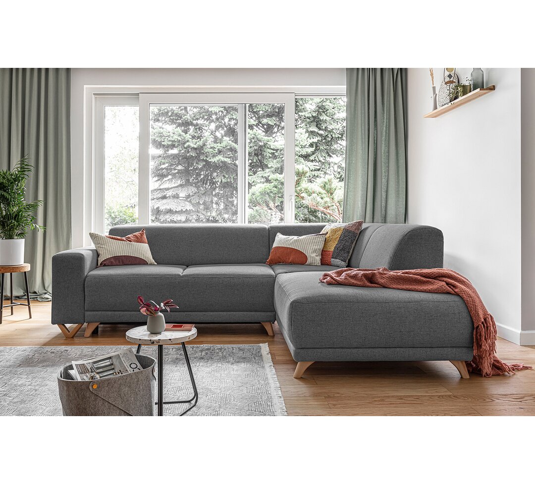 Sag hallo zum Ecksofa Classy Sophie mit Bettfunktion. Es bietet bequem Platz für mehr als fünf Personen und du kannst es ganz einfach in ein Bett umwandeln. Der Stoff in Leinenoptik und die massiven Holzbeine verleihen ihm eine naturbelassene Optik. Da es von allen Seiten vollständig bezogen ist, kannst du dieses Sofa auch in der Mitte eines Raumes aufstellen. Es hat eine praktische Seitentasche und bietet Stauraum für Decken und andere Dinge. MiuForm Polsterfarbe: Grau, Ausrichtung: Rechts ausgerichtet