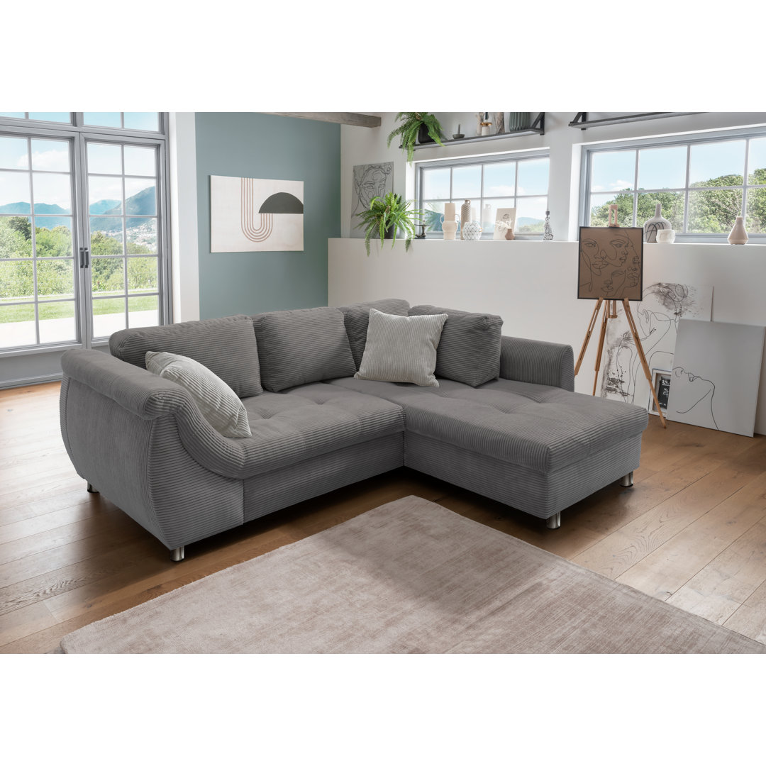 Elegant, modern und herrlich weich: Das Ecksofa Cornwall mit seiner geschwungenen Form bringt einen modernen Look mit Wohlfühlfaktor in dein Zuhause. Auf dem Sofa können fünf Personen bequem sitzen und nachts verwandelt es sich in ein bequemes Gästebett für zwei Personen. Hashtag Home Polsterfarbe: Cordstoff in Grau, Ausrichtung: Rechts ausgerichtet