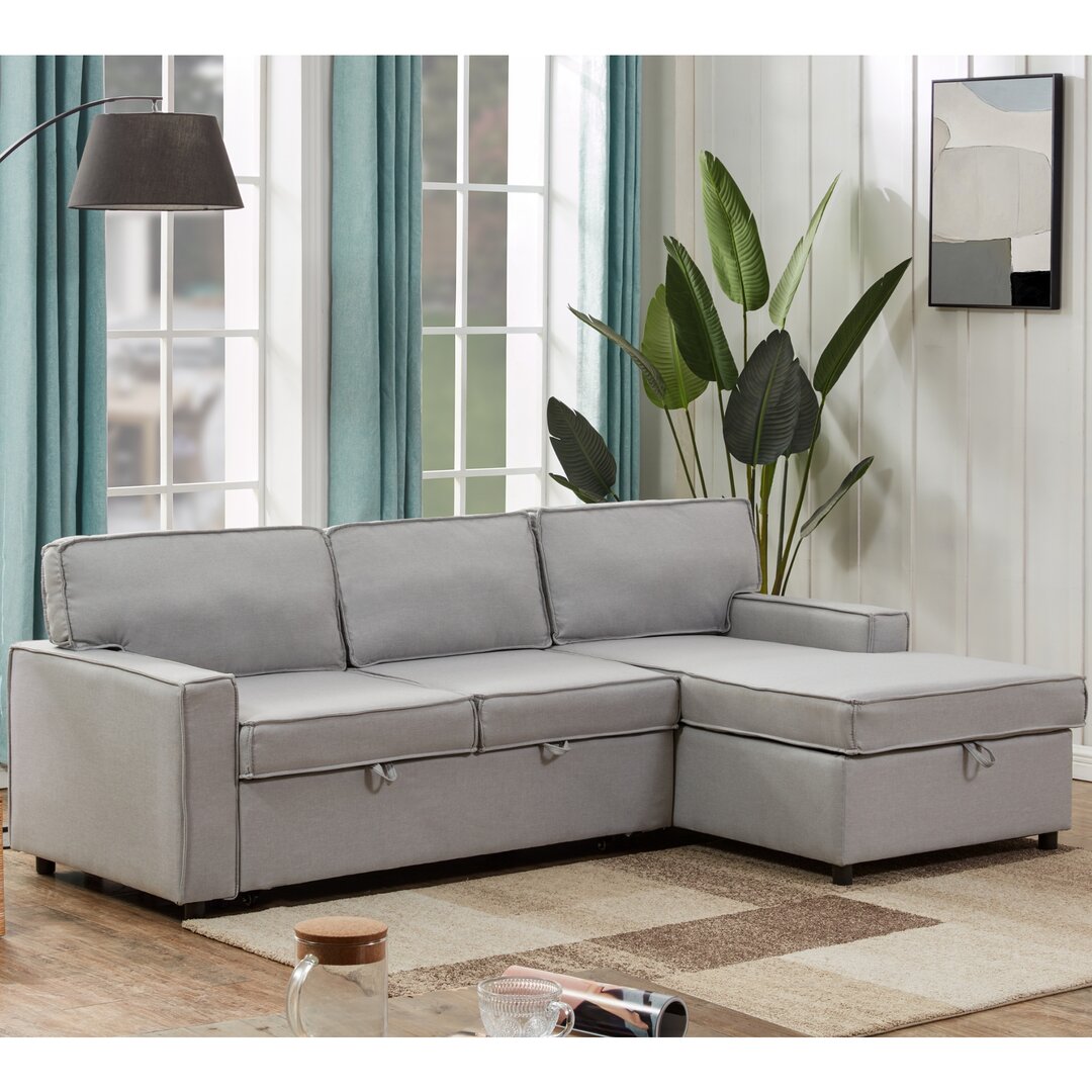 Dieses Ecksofa überzeugt mit seinem edlen Look in modischen Farben und passt perfekt zu jeder modernen Einrichtung. Das Sofa hat stilvolle Armlehnen mit Ziernieten und Aufbewahrungstasche. Die elegante Farbe und die hochwertigen Stoffe hellen deinen Raum auf. Das Ecksofa ist mit weichen Leinenbezügen gepolstert. Die Sitze sind mit weißer Polyesterfaser und Taschenfedern gefüllt, was für einen hohen Sitzkomfort sorgt. Benötigst du eine zusätzliche Schlafgelegenheit, kannst du das Sofa einfach in ein Bett umwandeln. Ebern Designs Polsterfarbe: Grau
