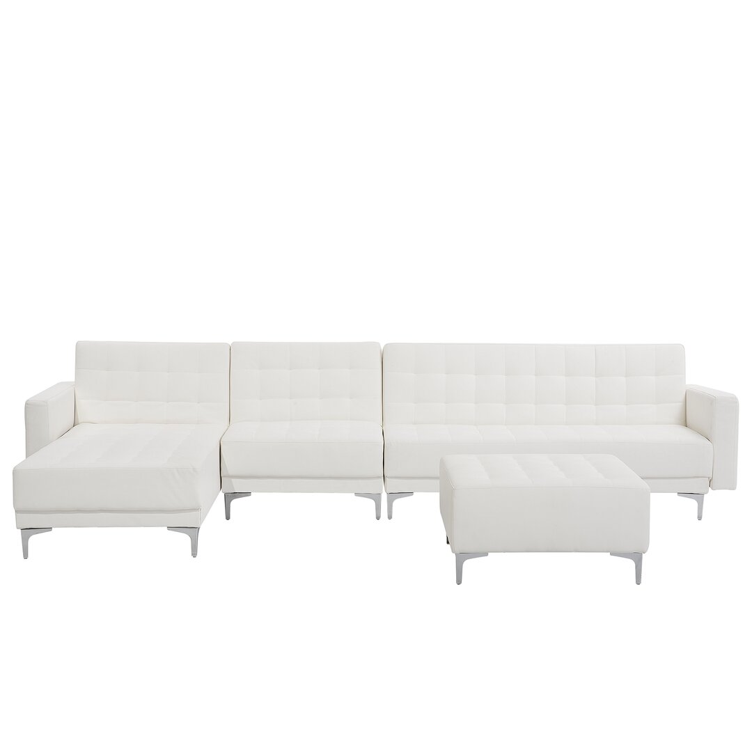 Diese Wohnlandschaft ist das ideale, vielseitige Ankerstück für dein Wohnzimmer. Einladend und wohnlich, besteht es aus einem Dreisitzer mit Chaiselongue und einem Abschnitt für eine erweiterte Sitzgelegenheit für eine Person. Vielseitig im Design kann das Sofa dank der verstellbaren Rückenlehne in ein bequemes Bett für zwei Personen verwandelt werden. Zusätzlich kann die Chaise auf beiden Seiten positioniert werden, um sie deinen Bedürfnissen anzupassen. Es ist vollständig mit hochwertigem, stilvollem weißem Kunstleder gepolstert und mit eleganten Tuftings versehen. Seine Funktionalität und sein zeitloser Stil machen es zum perfekten Sofa für dein modernes Zuhause. Das ganze Stück wird dank der Metallbeine stabil gehalten. Perspections Ausrichtung: Links ausgerichtet