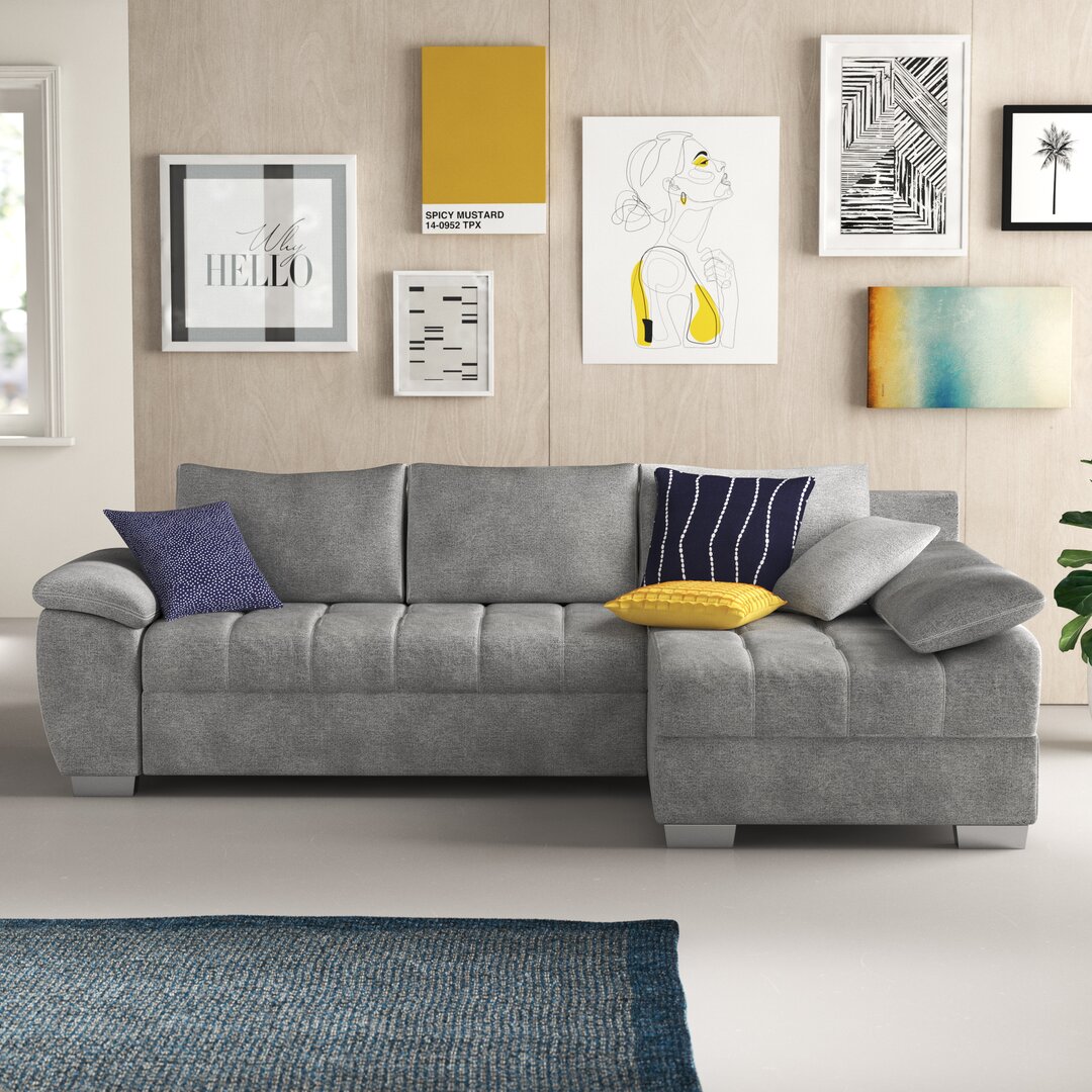 Das moderne Ecksofa Holly-Ann ist ein echter Blickfang für dein Zuhause. Seine hochwertige Polsterung mit No-Sag-Federung und Polyätherschaum im Sitz und Rücken sorgen für einen angenehmen Sitz- und Liegekomfort. Die Rückenlehne ist mit passendem Stoff bezogen, sodass du das Sofa frei im Raum platzieren kannst. Der geräumige Bettkasten bietet außerdem reichlich Stauraum. ModernMoments Polsterfarbe: Grau