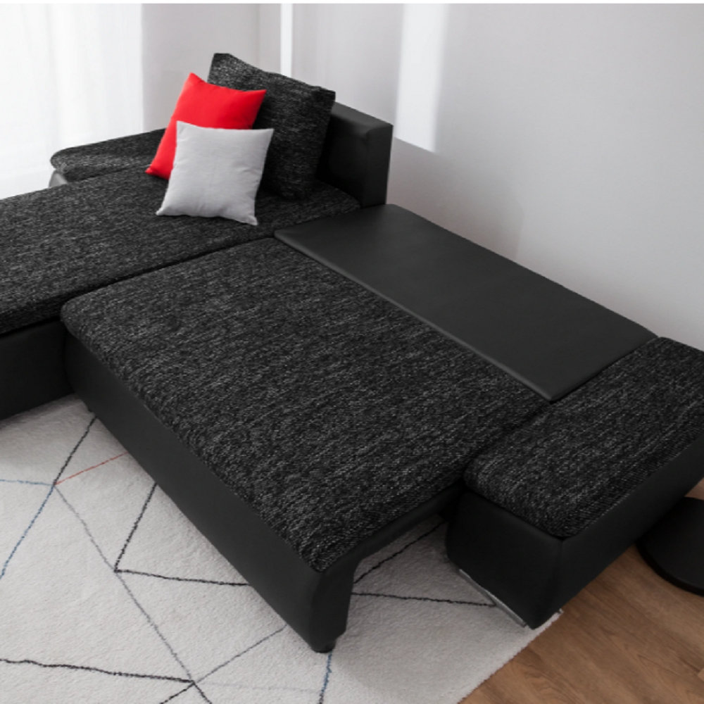 Die moderne Eckcouch mit Schlaffunktion ist die ideale Lösung für ein Wohnzimmer oder Apartment und ergänzt hervorragend die bestehende Wohnungseinrichtung. Mit den drei riesengroßen, kuscheligen Sofakissen und der unglaublich komfortablen Sitzoberfläche ist das Wohnzimmersofa in Eckform dazu geeignet, um mit Familie oder Freunden gemeinsam Zeit zu verbringen. Für mehr Ordnung ist die elegante Polstercouch mit einem praktischen Bettkasten zur Aufbewahrung von Bettwäsche oder Decken ausgestattet. Dank der rückenechten Ausführung kann das Ecksofa frei im Raum stehen. Die Stellfüße aus Metall in Chromoptik runden das Gesamtbild ab.Das Ecksofa lässt sich sehr einfach ausklappen und im Handumdrehen in ein bequemes Gästebett verwandeln. Dafür wird die Liegefläche mithilfe eines Schiebegestells nach vorne gezogen. Die gepolsterte Rückenlehne kann nach innen eingeklappt werden, wodurch eine Liegefläche von 200 x 136 cm entsteht. Die Wellenfederung und der hochelastische Schaumstoff sorgen für einen optimalen Schlaf- und Liegekomfort. Perspections Ausrichtung: Links ausgerichtet, Polsterfarbe: Dunkelgrau/Grau