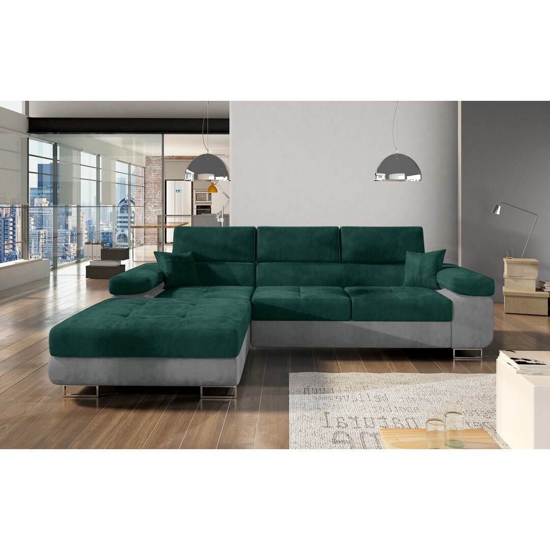 Dieses moderne Ecksofa mit Bettfunktion hat die perfekte Größe, um sich in nahezu jedes Wohnzimmer optimal einzufügen. ModernMoments Ausrichtung: Links ausgerichtet, Polsterfarbe: Dunkelgrün/Grau