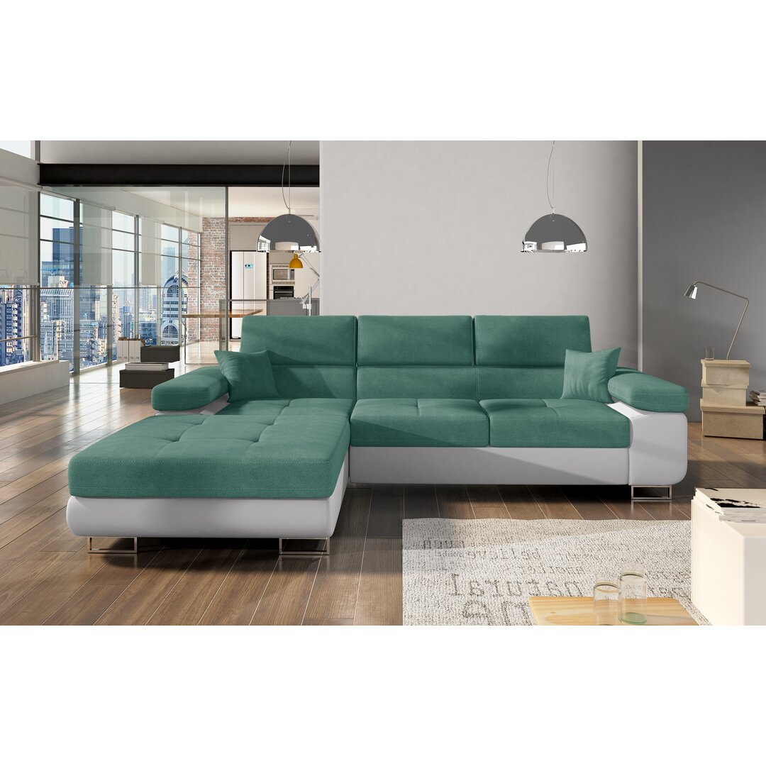 Dieses moderne Ecksofa mit Bettfunktion hat die perfekte Größe, um sich in nahezu jedes Wohnzimmer optimal einzufügen. ModernMoments Ausrichtung: Links ausgerichtet, Polsterfarbe: Blaugrün und Weiß