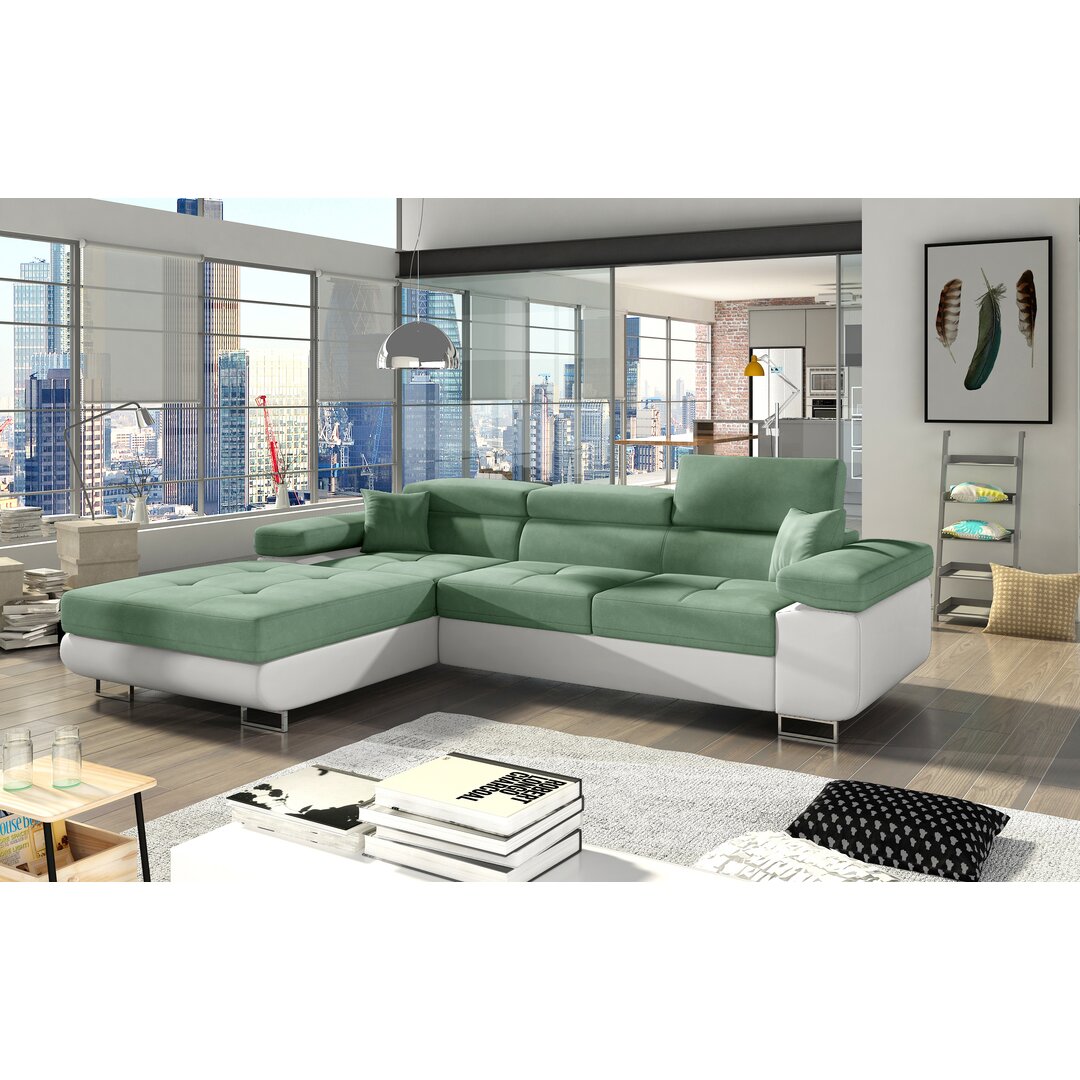 Dieses moderne Ecksofa mit Bettfunktion hat die perfekte Größe, um sich in nahezu jedes Wohnzimmer optimal einzufügen. ModernMoments Ausrichtung: Links ausgerichtet, Polsterfarbe: Grün/Weiß