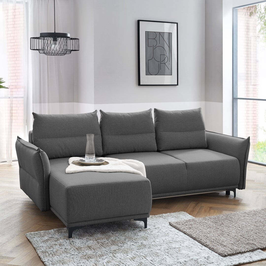 Dieses Ecksofa ist ein kompaktes, funktionales Möbelstück, das für ein modernes Wohnzimmer entworfen wurde. Die dekorativen Metallfüße in Schwarz verleihen ihm Leichtigkeit und Eleganz. Die Funktion der Rückenlehne wird von drei weichen Rückenkissen erfüllt. Wade Logan Ausrichtung: Links ausgerichtet, Polsterfarbe: Anthrazit