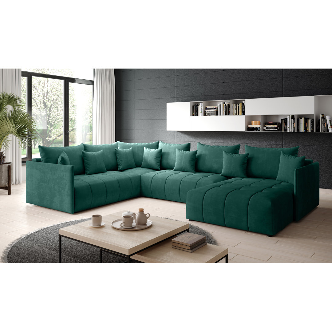 Das bequeme, geräumige U-förmige Ecksofa mit Bettfunktion ist die ideale Lösung für ein geräumiges Wohnzimmer, ein Loft oder eine größere Wohnung. Es bietet Platz für mehrere Personen und garantiert hervorragende Entspannung. Dank seiner U-Form ist das gemütliche Ecksofa perfekt, um Zeit mit der Familie oder Freunden zu verbringen, fernzusehen, zu plaudern oder einfach nur Spaß zu haben. Die kuscheligen Sofakissen bieten eine zusätzliche Stütze für den Rücken und sorgen für eine gemütliche Atmosphäre. Die hochelastische Polsterung sorgt für außergewöhnlichen Sitz- und Liegekomfort. Für mehr Ordnung im Wohnzimmer ist das elegante Sofa mit einem praktischen Bettkasten zum Verstauen von Bettwäsche oder Decken ausgestattet. Dank des rückenfreien Designs kann das Ecksofa frei im Raum stehen und trennt so den Entspannungsbereich vom Essbereich. Das robuste Gestell aus Kiefernholz und Möbelplatte garantiert die erforderliche Stabilität und Langlebigkeit des Möbelstücks. U-förmiges Sofa: 345 cm B x 83 cm H x 229 cm T; Oberfläche: 145 x 315 cm; Box: 110 x 70 cm; Sitzhöhe: 39 cm, Sitztiefe mit Kissen 64 cm, ohne Kissen 90 cm; Niedrige Kunststofffüße; Solide Konstruktion: Stabiles Gestell aus Kiefernholz und Möbelplatte; Sitzfederung mit Wellenfedern, Polsterwatte und elastischem Polyurethanschaum T30; Federung der Rückenlehne mit Wellenfedern, Polsterung mit Schaumgranulat, Polsterwatte und Polyurethanschaum T30. Metro Lane Polsterfarbe: Blau