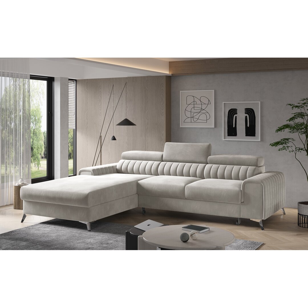 Reinhard – Komfort und Eleganz. Dieses Modell hat nicht nur eine konturierte Rückenlehne und bewegliche, verstellbare Kopfstützen, sondern auch einen einzigartigen, modernen Look. Ganz nach deinem Geschmack, ob du dein Wohnzimmer mit zarten Farben beleben willst oder mit gedämpften Einrichtungselementen und kontrastierenden Schattierungen der Polsterung. Die neun Zentimeter hohen Stahlbeine verleihen ihm außerdem einen besonderen Charme. Neben seinem ungewöhnlichen Design zeichnet er sich auch durch maximalen Komfort aus. Der Sitz des Möbels ist unter anderem für die Förderung von T30 + HR gemacht, was seine Höhe und Elastizität erhöht. Keine Dellen, keine Kratzer, und das auf höchstem Niveau. Wenn die tägliche Entspannung nicht ausreicht – nutze Reinhards Produkte auch zum Entspannen in der Nacht! Ein zusätzliches Plus ist auch der geräumige Behälter für das Bettzeug. Reibe dir nicht verwundert die Augen, sondern probiere das Ecksofa jetzt selbst aus. Metro Lane Polsterfarbe: Weiß, Ausrichtung: Ausrichtung Links