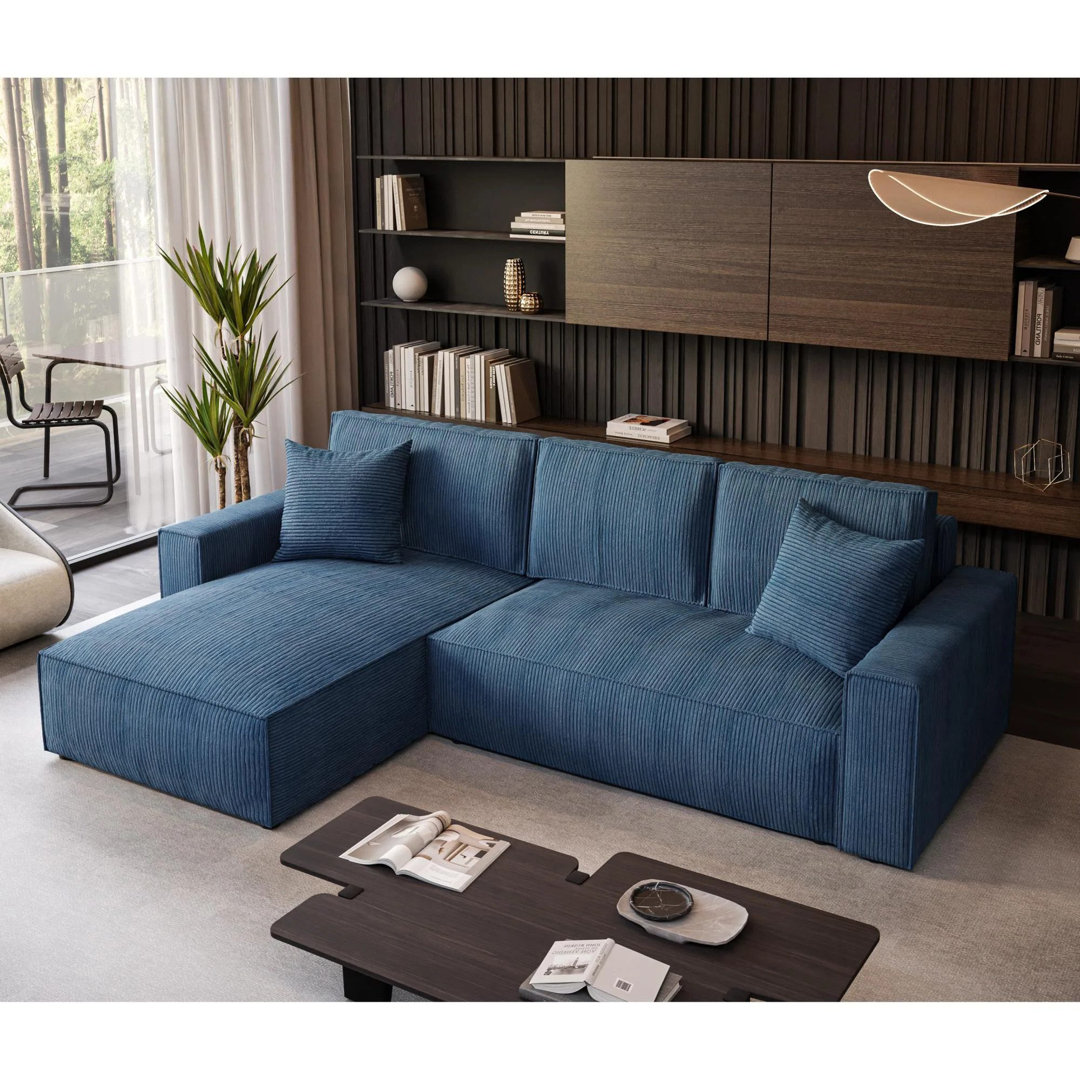 Das L-förmige Ecksofa Parys fügt sich perfekt in ein modernes Wohnzimmer ein. Das 290 cm breite Ecksofa Parys ist mit einer Schlaffunktion ausgestattet, die eine Liegefläche von 244 x 140 cm und einen Bettkasten schafft. Der Rahmen ist aus Massivholz und Spanplatten gefertigt. Das Schlafsofa hat einen Universalhocker, mit dem du die Ecke jederzeit von rechts nach links und umgekehrt wechseln kannst. 17 Stories Polsterfarbe: Blau, Ausrichtung: Linksseitig ausgerichtet