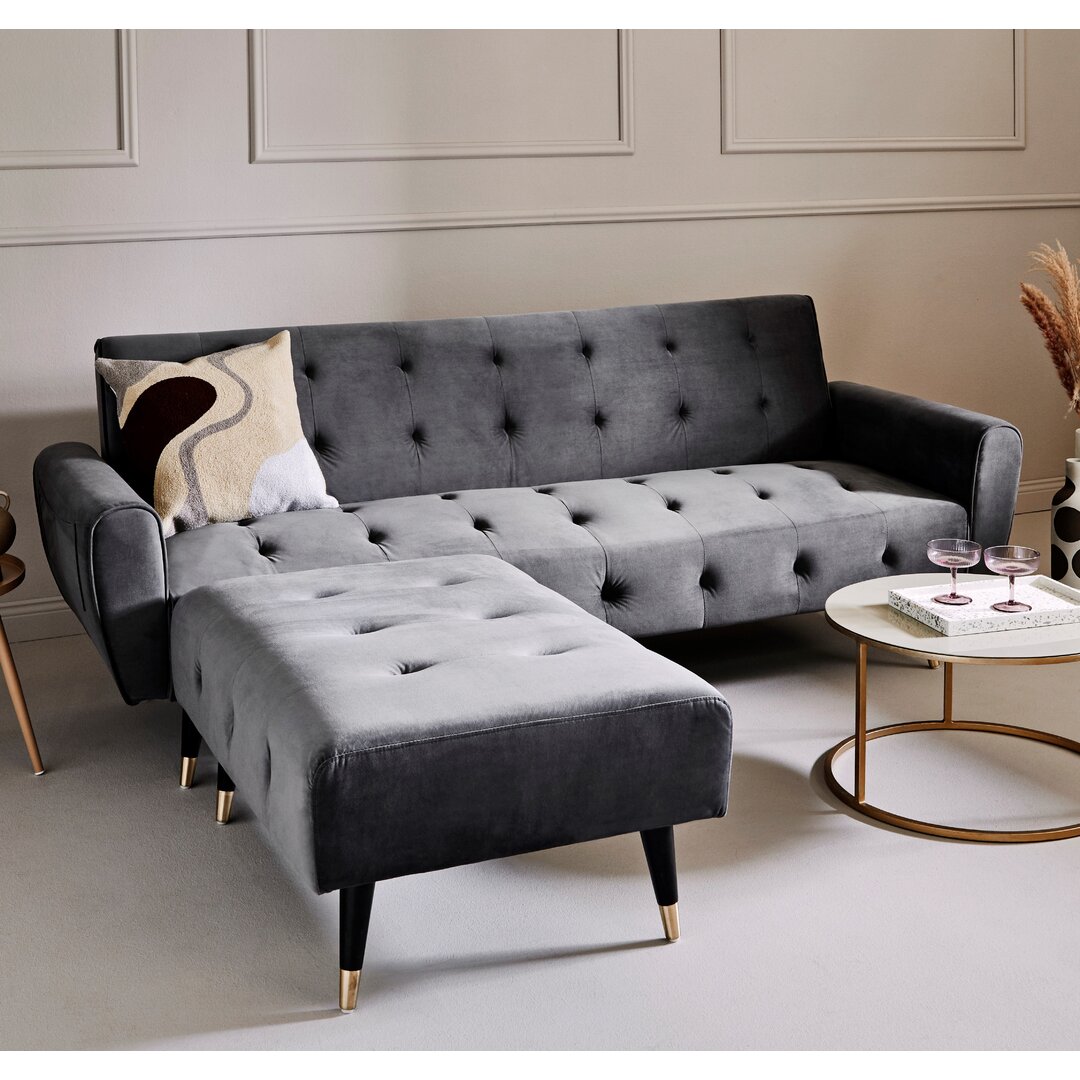 Dieses Ecksofa ist auch für kleine Räume eine große Lösung. Sitzen, liegen und schlafen in einem. Es ist nicht einfach nur ein Sofa – es ist ein Sofa mit einer ausgeklügelten Schlaffunktion, indem die Rückenlehne zurückgeklappt und mit ausklappbaren Metallfüßen gestützt wird. Damit ist ein sicherer Stand auch bei großen Belastungen gewährleistet. Die edlen, schwarzen Füße mit Kappen in Goldoptik vervollständigen das Design. Und als besondere Funktion bietet es auch eine schicke Seitentasche an der Außenseite der Armlehne, damit du hier viel verstauen kannst. Du kannst den Hocker so positionieren, wie du willst, damit du deine Entspannungszone so gestalten kannst, wie du es möchtest. Etta Avenue Polsterfarbe: Grau