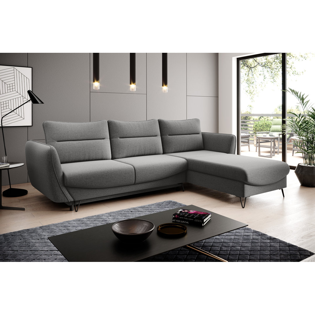 Dieses Ecksofa ist eine stilvolle Wahl mit Schlaffunktion. Das beliebte Ecksofa hat ein zeitloses Design, und seine schwarzen, charakteristischen Stahlbeine verleihen ihm Stil und moderne Eleganz. Die L-Form macht es zu einer natürlich geselligen Sitzgelegenheit. Du kannst problemlos ein Familientreffen organisieren oder Freunde zu einem Spieleabend einladen. In dem Wohnzimmer, in dem das Ecksofa stehen wird, gibt es mit Sicherheit viel Platz für ein gemütliches Gespräch und einen angenehmen Nachmittag. Das Ecksofa hat eine lange Lebensdauer, da die Sitzkissen mit hochelastischem HR-Schaum gefüllt sind, der den Körper gut stützt und beim Aufstehen schnell wieder seine ursprüngliche Form annimmt. Die gewellte Feder im Sitz des Möbels ist dafür verantwortlich, dass die Sitzfläche nicht zusammenfällt. Die Abmessungen des Möbels machen es möglich, es in vielen verschiedenen Konfigurationen aufzustellen. Ein weiterer Pluspunkt ist, dass das Ecksofa in eine schicke Farbe hat und mit einem stilvollen Stoff bezogen ist, sodass es genau zu deiner Einrichtung passt. Mit dem Ecksofa, das sich nachts in ein ausklappbares Bett verwandelt, bringst du Vielseitigkeit in jeden Raum, ohne auf Stil verzichten zu müssen. Der Vorteil des Möbels ist außerdem ein geräumiger Aufbewahrungsbereich für Bettzeug, der sich in der Eckhockerbank versteckt. Das Aufklappen ist auch eine extrem einfache Angelegenheit, denn der hier verwendete DL-Mechanismus ist ein sehr einfacher und intuitiver Mechanismus. Es genügt, den Teil des Möbelstücks herauszuziehen, der als Sitzfläche dient, und dann die Rückenlehne in den neu entstandenen leeren Raum zu senken. Später kannst du deine Familie oder Freunde einladen und die Nacht in einer Ecke verbringen, ohne dir Gedanken über den Komfort ihrer Ruhe machen zu müssen. Es lohnt sich, mit eigenen Augen zu sehen, dass das eine gute Wahl ist. Fairmont Park Stoff: Grau, Ausrichtung: Ausrichtung Rechts