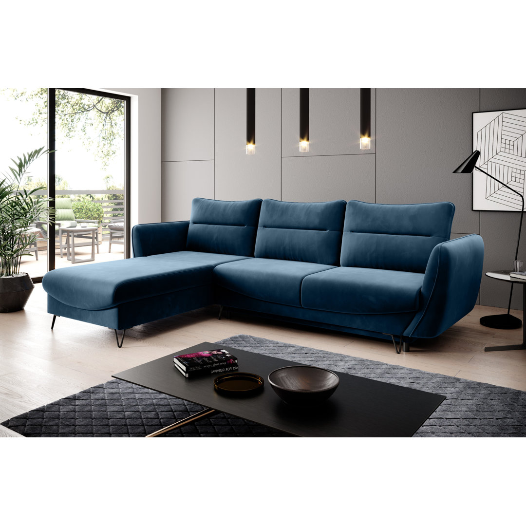 Ecksofa – ein stilvolles Ecksofa mit Schlaffunktion. Unser geliebtes Ecksofa hat ein zeitloses Design, und seine schwarzen, charakteristischen Stahlbeine verleihen ihm Stil und moderne Eleganz. Die L-Form macht es zu einer natürlich geselligen Sitzgelegenheit. Du kannst problemlos ein Familientreffen organisieren oder Freunde zu einem Spieleabend einladen. In dem Wohnzimmer, in dem das Ecksofa stehen wird, gibt es mit Sicherheit viel Platz für ein gemütliches Gespräch und einen angenehmen Nachmittag. Das Ecksofa wird eine lange Lebensdauer haben, da die Sitzkissen mit hochelastischem HR-Schaum gefüllt sind, der den Körper gut stützt und beim Aufstehen schnell wieder seine ursprüngliche Form annimmt. Die gewellte Feder, die im Sitz des Möbels verwendet wird, ist dafür verantwortlich, dass der Sitz nicht zusammenfällt. Die Abmessungen des Möbelstücks ermöglichen es,dir das Ecksofa in vielen verschiedenen Konfigurationen aufzustellen. Bringe Vielseitigkeit in jeden Raum, ohne auf Stil zu verzichten, dank des Ecksofas, das sich nachts in ein ausklappbares Bett verwandelt. Darüber hinaus bietet das Möbelstücks auch einen geräumiger Behälter für Bettzeug, der in dem Ecksofa versteckt ist. Auch das Ausklappen ist eine äußerst einfache Angelegenheit, denn die in diesem Fall verwendete Mechanik DL ist sehr leicht und intuitiv. Es genügt, den Teil des Möbelstücks, der als Sitzfläche dient, herauszuziehen und dann die Rückenlehne in den neu entstandenen leeren Raum zu senken. Später kannst du deine Familie oder Freunde einladen und den Abend gemütlich ausklingen lassen, ohne dass du dir Sorgen um die Bequemlichkeit des Schlafs machen musst. Überzeuge dich selbst davon, dass dies eine gute Wahl ist! Wir bieten auch einen Sessel, einen Hocker, ein Sofa und ein Set an, die perfekt zu dem Sofa passen. Fairmont Park Ausrichtung: Ausrichtung Links, Stoff: Blau