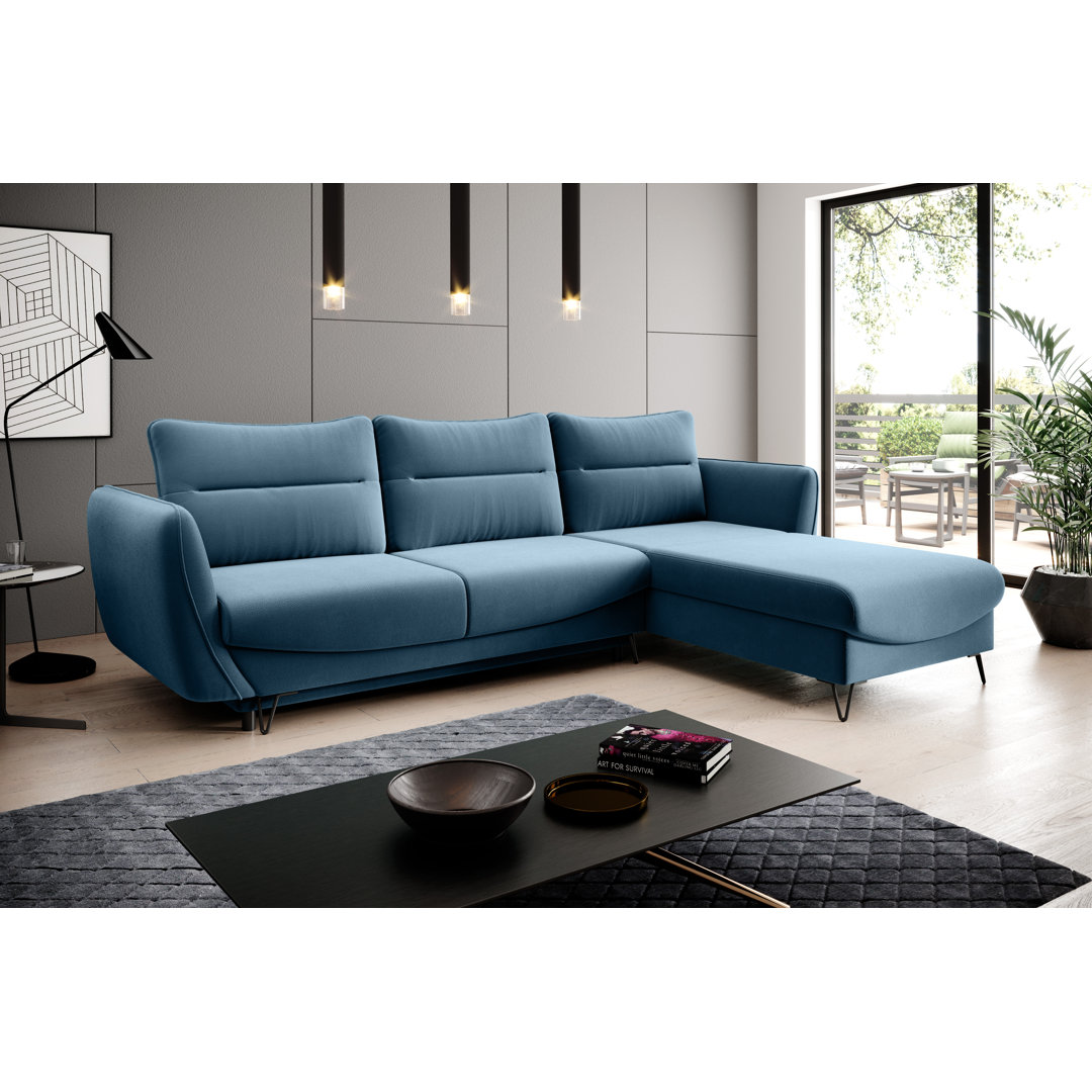 Ecksofa – ein stilvolles Ecksofa mit Schlaffunktion. Unser geliebtes Ecksofa hat ein zeitloses Design, und seine schwarzen, charakteristischen Stahlbeine verleihen ihm Stil und moderne Eleganz. Die L-Form macht es zu einer natürlich geselligen Sitzgelegenheit. Du kannst problemlos ein Familientreffen organisieren oder Freunde zu einem Spieleabend einladen. In dem Wohnzimmer, in dem das Ecksofa stehen wird, gibt es mit Sicherheit viel Platz für ein gemütliches Gespräch und einen angenehmen Nachmittag. Das Ecksofa wird eine lange Lebensdauer haben, da die Sitzkissen mit hochelastischem HR-Schaum gefüllt sind, der den Körper gut stützt und beim Aufstehen schnell wieder seine ursprüngliche Form annimmt. Die gewellte Feder, die im Sitz des Möbels verwendet wird, ist dafür verantwortlich, dass der Sitz nicht zusammenfällt. Die Abmessungen des Möbelstücks ermöglichen es,dir das Ecksofa in vielen verschiedenen Konfigurationen aufzustellen. Bringe Vielseitigkeit in jeden Raum, ohne auf Stil zu verzichten, dank des Ecksofas, das sich nachts in ein ausklappbares Bett verwandelt. Darüber hinaus bietet das Möbelstücks auch einen geräumiger Behälter für Bettzeug, der in dem Ecksofa versteckt ist. Auch das Ausklappen ist eine äußerst einfache Angelegenheit, denn die in diesem Fall verwendete Mechanik DL ist sehr leicht und intuitiv. Es genügt, den Teil des Möbelstücks, der als Sitzfläche dient, herauszuziehen und dann die Rückenlehne in den neu entstandenen leeren Raum zu senken. Später kannst du deine Familie oder Freunde einladen und den Abend gemütlich ausklingen lassen, ohne dass du dir Sorgen um die Bequemlichkeit des Schlafs machen musst. Überzeuge dich selbst davon, dass dies eine gute Wahl ist! Wir bieten auch einen Sessel, einen Hocker, ein Sofa und ein Set an, die perfekt zu dem Sofa passen. Fairmont Park Stoff: Blau, Ausrichtung: Ausrichtung Rechts