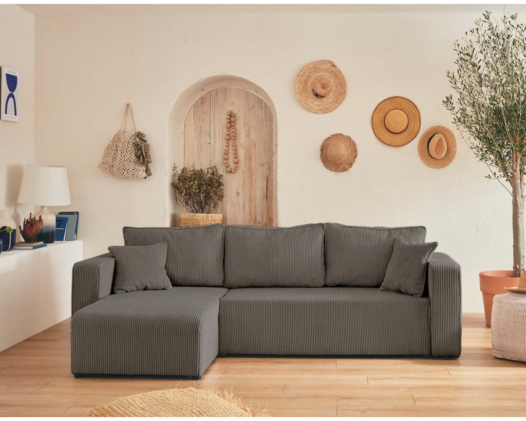 Entdecke das 4-Sitzer-Wende-Ecksofa Topaze, das das Herzstück deines Wohnzimmers sein wird. Mit seinen abgerundeten Linien und der Cord-Polsterung passt es problemlos in jedes Interieur. Das Sofa Topaze bietet viele Vorteile: Es hat eine Wendeecke, mit der du die Ecke ganz einfach links oder rechts des Sofas positionieren kannst. Es ist umwandelbar und verfügt über eine Aufbewahrungsbox, in der du deine Kissen und Plaids perfekt verstauen kannst. Technische Beschreibung Sitzplatzkapazität: 4 Herstellung : Europa Position der Ecke: Umkehrbar, du kannst deine Ecke nach Belieben links oder rechts positionieren Umwandelbar : Ja Art der Umwandlung: Umklappbare Rückenlehne Schlafkapazität : Gelegentlich Aufbewahrungsbox : Ja Struktur aus Holz und Spanplatten Sitz: 25kg/m3 dichter Polyurethanschaum Federung: Zick-Zack-Federn Rücken: Schaumstoffflocken Polsterung: 100% Polyester Kord Schwarze Kunststofffüße 2 Zierkissen enthalten Aufbau: in wenigen Minuten, Anleitung enthalten Maße des Sofas Gesamtabmessungen: B245xH85xT140 cm Breite: 245 cm Höhe: 85 cm Tiefe: 140 cm Rückenhöhe: 67 cm Sitzhöhe: 37 cm Breite des mittleren Teils der Sitzfläche: 133 cm Breite des Ecksitzes: 75 cm Gesamte Sitzbreite: 208 cm Sitztiefe Mittelteil mit Kissen: 63 cm Sitztiefe Ecksitz mit Kissen: 133 cm Breite der Armlehnen: 18,5 cm Höhe der Armlehnen: 59 cm Tiefe der Armlehnen: 88 cm Beinhöhe: 2,5 cm Bettabmessungen: 208×130 cm Abmessungen des Pakets Paket 1: 35x57x90 cm / 18,5 kg Paket 2: 35x70x135 cm / 30 kg Paket 3: 65x75x150 cm / 36 kg Lisa design Polsterfarbe: Grau