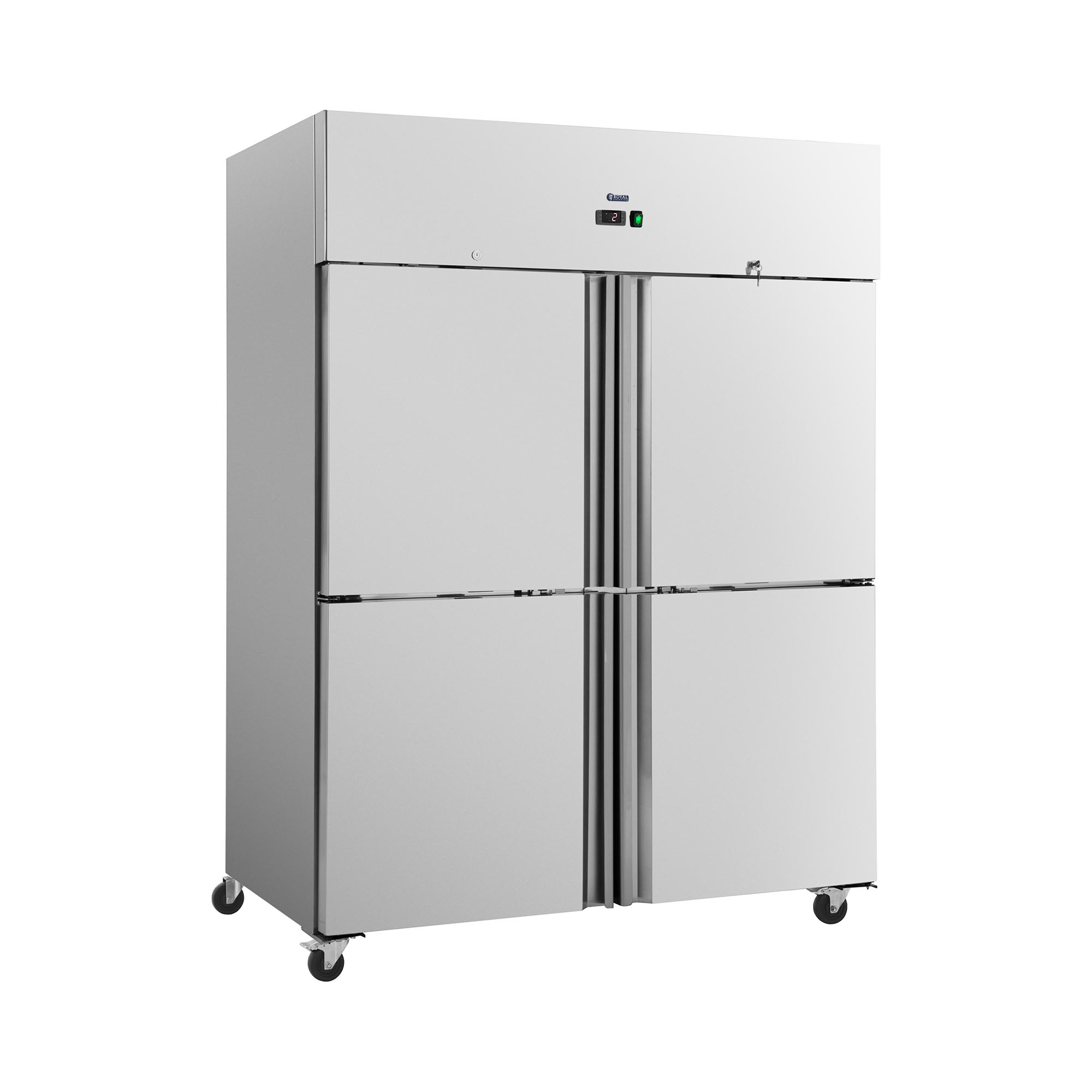 Der Gastro-Kühlschrank von Royal Catering bietet reichlich Platz, um auch für einen großen Kundenandrang immer genügend gekühlte Waren vorrätig zu halten. Der Kühlschrank steht auf vier Rollen, mit denen Sie ihn auch auf rauen Böden mühelos verschieben. Die Feststellbremsen sorgen für einen sicheren Stand, sobald Sie das Gerät wie gewünscht positioniert haben. Der Kühlschrank ist abschließbar, sodass Sie die gekühlten Lebensmittel vor unbefugtem Zugriff sichern. Der Gastronomie-Kühlschrank hat ein Fassungsvermögen von 1001 l. Dabei spielt es keine Rolle, ob Sie auf frisches Gemüse, vorbereitete Speisen und Soßen, Getränke, Suppen oder Milchprodukte zurückgreifen, der Gewerbekühlschrank verwahrt alles zuverlässig gekühlt. Für eine optimale Auslastung des Innenraums stehen Ihnen insgesamt sechs Ablageroste zur Verfügung, die Sie nach Belieben in verschiedenen Höhe einlegen. Der sanfte Öffnungs- und Schließmechanismus der vier Schwenktüren erleichtert die Handhabung im hektischen Alltag, gerade wenn Sie keine Hand frei haben. Für eine schnelle Kühlung sorgt das umweltfreundliche Kältemittel R290. Es besitzt ausgezeichnete thermodynamische Eigenschaften und überzeugt durch eine hohe Energieeffizienz. Über das digitale Thermostat steuern Sie die Kühltemperatur präzise zwischen 2 und 8 °C. Dadurch passen Sie die Kühlung optimal an die gelagerten Lebensmittel an. Die automatische Abtaufunktion hält den Kühlschrank zu jeder Zeit eisfrei. Dadurch verringert sich der Wartungsaufwand und Sie lagern Ihre Lebensmittel ununterbrochen, ohne abtauen zu müssen. Das hochwertige Gehäuse des Gastronomie-Kühlschranks besteht aus Edelstahl. Das Material ist besonders widerstandsfähig, langlebig und pflegeleicht. Die glatten Oberflächen reinigen Sie mühelos.