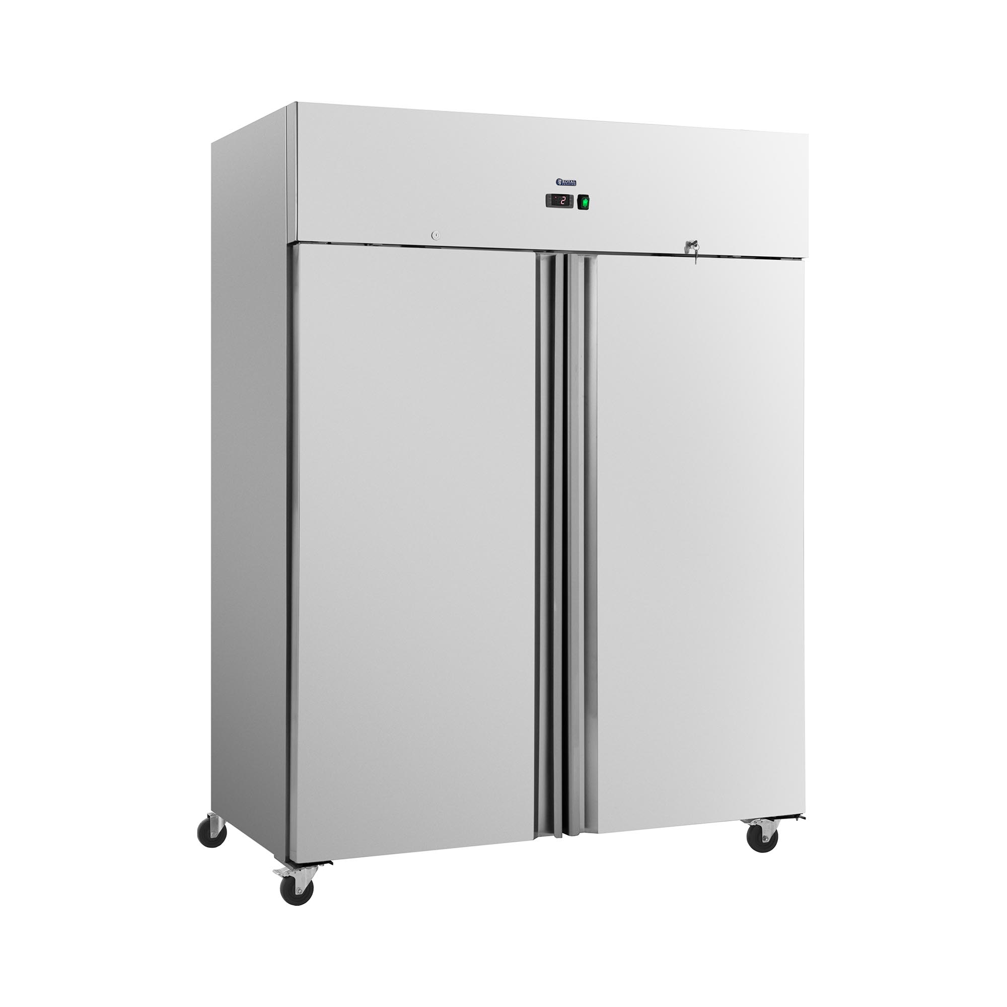 Der Gastro-Kühlschrank von Royal Catering bietet reichlich Platz, um auch für einen großen Kundenandrang immer genügend gekühlte Waren vorrätig zu halten. Der Kühlschrank steht auf vier Rollen, mit denen Sie ihn auch auf rauen Böden mühelos verschieben. Die Feststellbremsen sorgen für einen sicheren Stand, sobald Sie das Gerät wie gewünscht positioniert haben. Der Kühlschrank ist abschließbar, sodass Sie die gekühlten Lebensmittel vor unbefugtem Zugriff sichern. Der Gastronomie-Kühlschrank hat ein Fassungsvermögen von 800 l. Dabei spielt es keine Rolle, ob Sie auf frisches Gemüse, vorbereitete Speisen und Soßen, Getränke, Suppen oder Milchprodukte zurückgreifen, der Gewerbekühlschrank verwahrt alles zuverlässig gekühlt. Für eine optimale Auslastung des Innenraums stehen Ihnen insgesamt sechs Ablageroste zur Verfügung, die Sie nach Belieben in verschiedenen Höhe einlegen. Der sanfte Öffnungs- und Schließmechanismus der zwei Schwenktüren erleichtert die Handhabung im hektischen Alltag, gerade wenn Sie keine Hand frei haben. Für eine schnelle Kühlung sorgt das umweltfreundliche Kältemittel R290. Es besitzt ausgezeichnete thermodynamische Eigenschaften und überzeugt durch eine hohe Energieeffizienz. Über das digitale Thermostat steuern Sie die Kühltemperatur präzise zwischen -2 und 8 °C. Dadurch passen Sie die Kühlung optimal an die gelagerten Lebensmittel an. Die automatische Abtaufunktion hält den Kühlschrank zu jeder Zeit eisfrei. Dadurch verringert sich der Wartungsaufwand und Sie lagern Ihre Lebensmittel ununterbrochen, ohne abtauen zu müssen. Das hochwertige Gehäuse des Gastronomie-Kühlschranks besteht aus Edelstahl. Das Material ist besonders widerstandsfähig, langlebig und pflegeleicht. Die glatten Oberflächen reinigen Sie mühelos.