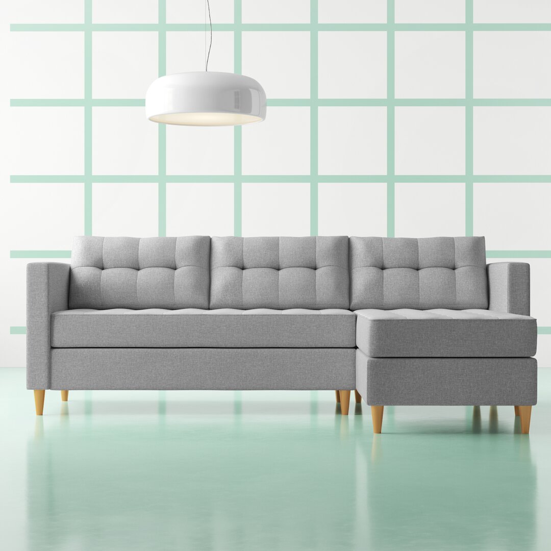 Bist du auf der Suche nach einem modernen, praktischen Sofa? Das modulare Ecksofa Dev lässt sich im Handumdrehen in ein Bett umwandeln und bietet genügend Stauraum für Bettzeug und andere Dinge. Auf dem Sofa ist Platz für vier Personen – perfekt für einen Abend, an dem man gemeinsam eine Fernsehserie anschaut. Hashtag Home Polsterfarbe: Grau
